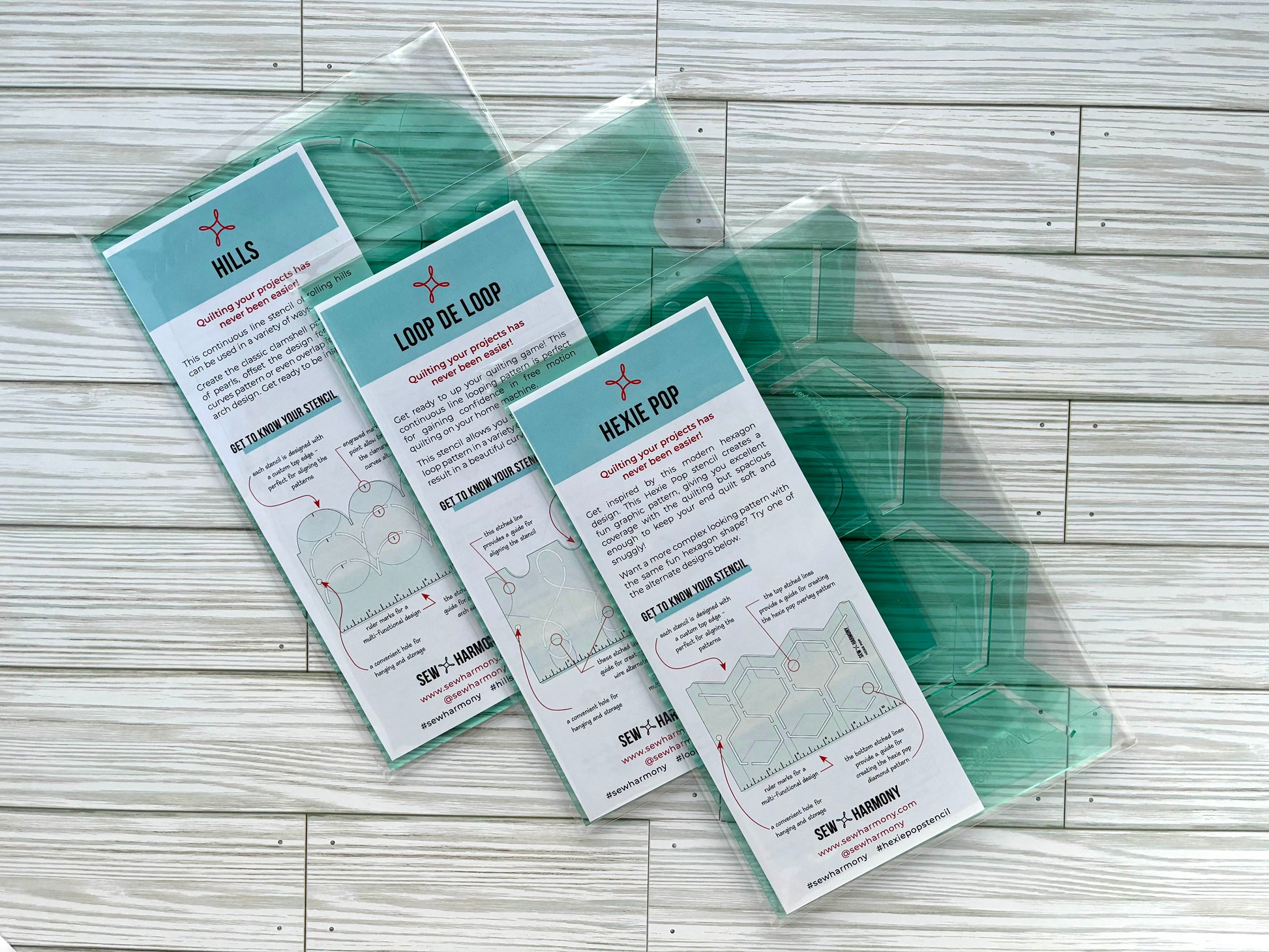In this bundle, you will receive one each of the Hexie Pop, Hills, and the Loop De Loop stencils. Made from 3mm transparent green acrylic material, each stencil features a custom top edge and features etched lines and markings for easy alignment.